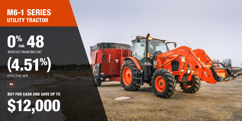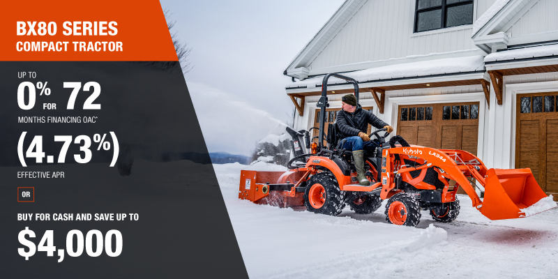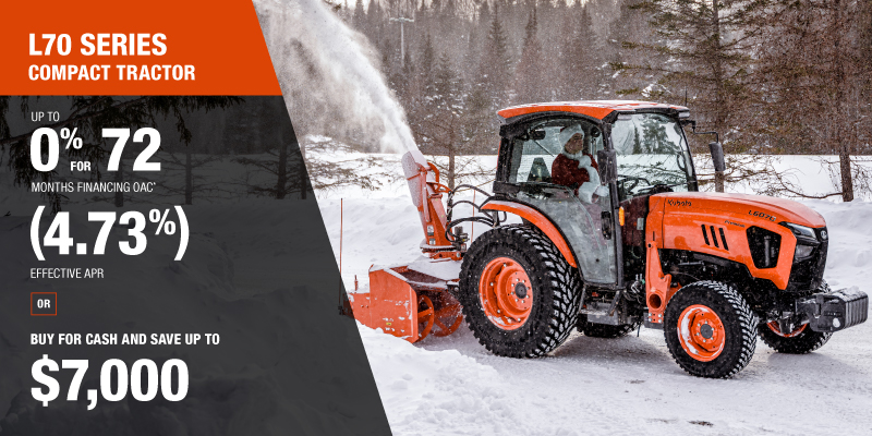 *For all offers: Prices and payments include freight and other applicable fees (including environmental fees, administration fees, set-up fees, and dealer fees). Taxes, delivery fees, insurance and registration are extra. Dealer may sell for less. Dealer order/trade may be necessary (but may not be available in all cases). Some restrictions apply. Offers valid only at participating dealers in Canada and are subject to change, cancellation or extension at any time without notice or obligation. Minimum down payment of 10% required for financing offers on turf and agricultural products. Specifications, features, illustrations and equipment shown are based on the latest available information at the time of publication. Some models are shown with optional accessories available at extra cost. Although descriptions are believed to be correct, accuracy cannot be guaranteed. We reserve the right to make changes at any time, without notice or obligation to specifications, accessories, materials, models, prices, payments and other information. Offer valid until January 12, 2026. See your participating Kubota dealer or visit www.kubota.ca for complete details.